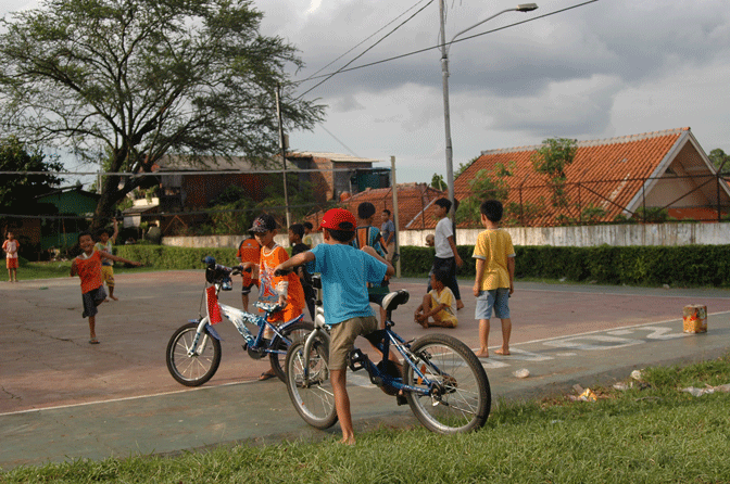Setiap sore, riuh tawa anak-anak meramaikan taman ini, mengalahkan suara klakson mobil dan motor yang tak sabar melewati kemacetan. Taman ini memiliki perosotan, dan beberapa mainan lainnya yang sering kita jumpai di Taman Kanak-Kanak (TK). Ibu-ibu pun ikut berkumpul di sana. Ada yang sambil menyuapi anaknya, ada yang sekedar rumpi-rumpi, namun ada juga yang membakar kalori. Yaitu ibu-ibu anggota klub bola voli. Mereka aktif bermain bola Voli di taman ini hampir setiap sore. Tepatnya di sebuah lapangan mini yang multifungsi. Sebagai lapangan voli sekaligus arena main sepeda anak-anak. Adapula sebagian anak-anak yang memanfaatkan ruang-ruang taman berumput hijau untuk bermain bola ala kadarnya.